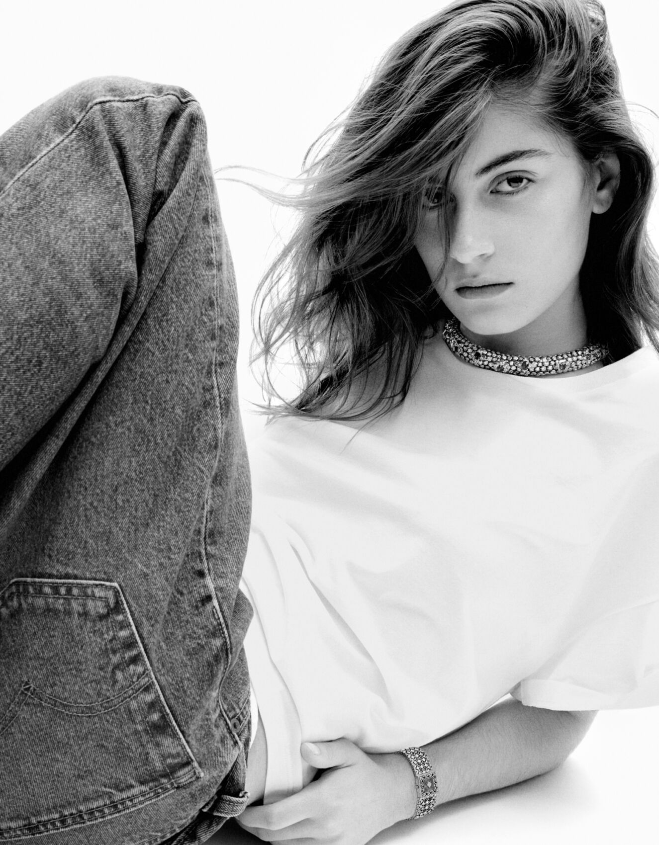 A person with long, flowing hair gazes directly at the viewer. They wear a plain white shirt and blue jeans, accompanied by a sparkling necklace and bracelet that catch the light. The composition is relaxed, with the individual reclining and one arm resting near their waist. The overall mood is calm, stylish, and subtly elegant.