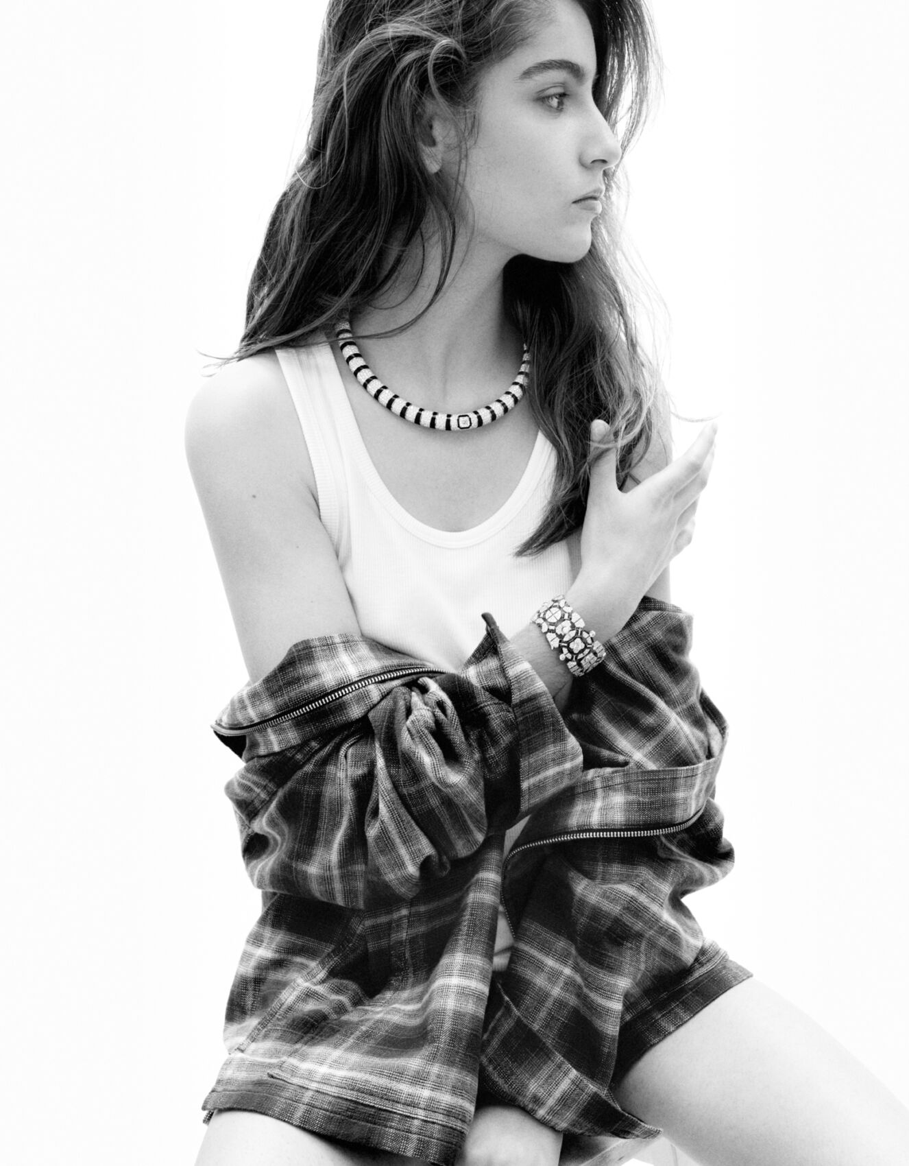 A pensive young woman gazes to the side, her long hair cascading over her shoulder. She wears a sleeveless top, layered with a plaid jacket draped casually. A chunky necklace adorns her neck, while her wrist and fingers are decorated with a stylish bracelet. The overall atmosphere is one of introspection and casual elegance.