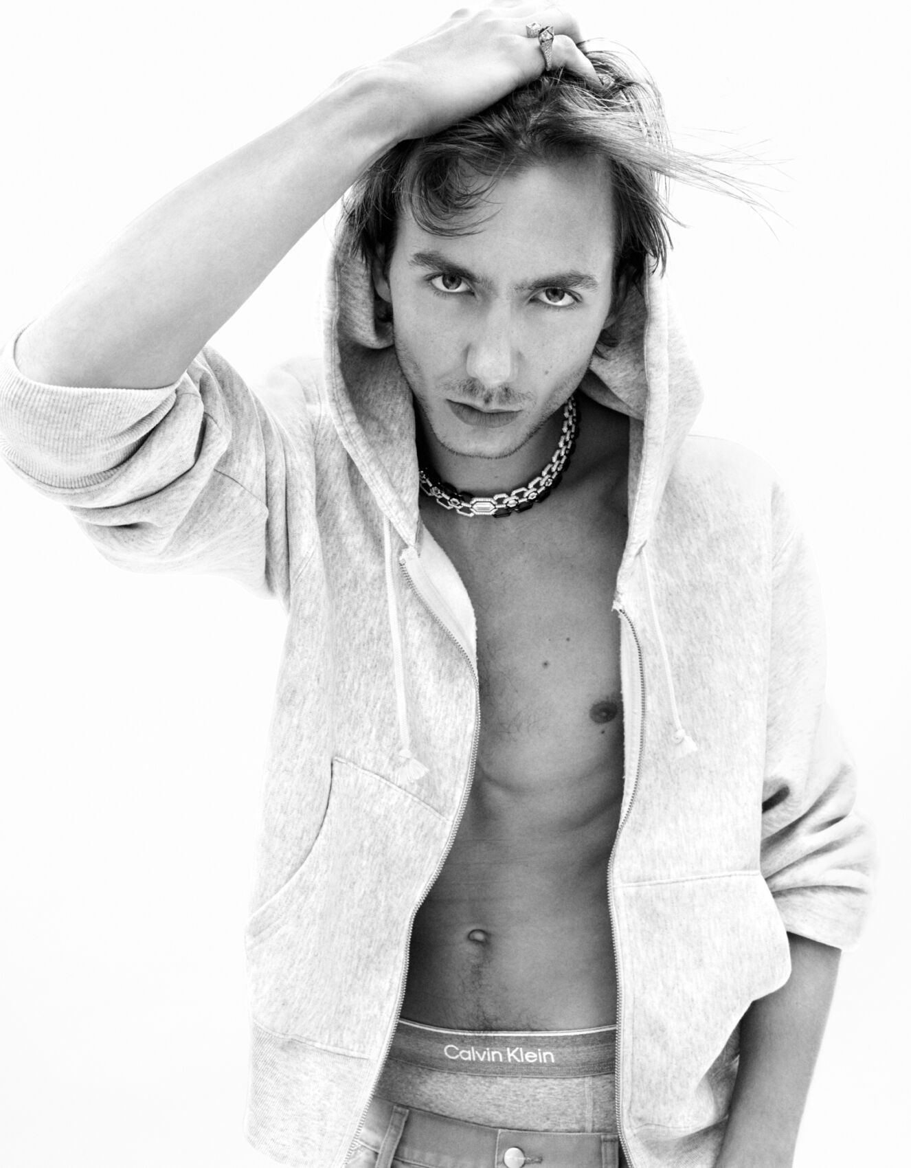A person poses with a confident expression, wearing an open hooded sweatshirt revealing a muscular torso, with one hand running through their hair. A chunky chain necklace adorns their neck. The monochrome setting highlights the person's edgy and casual style, with minimalistic background, emphasizing the contrast and detail in their features and attire.