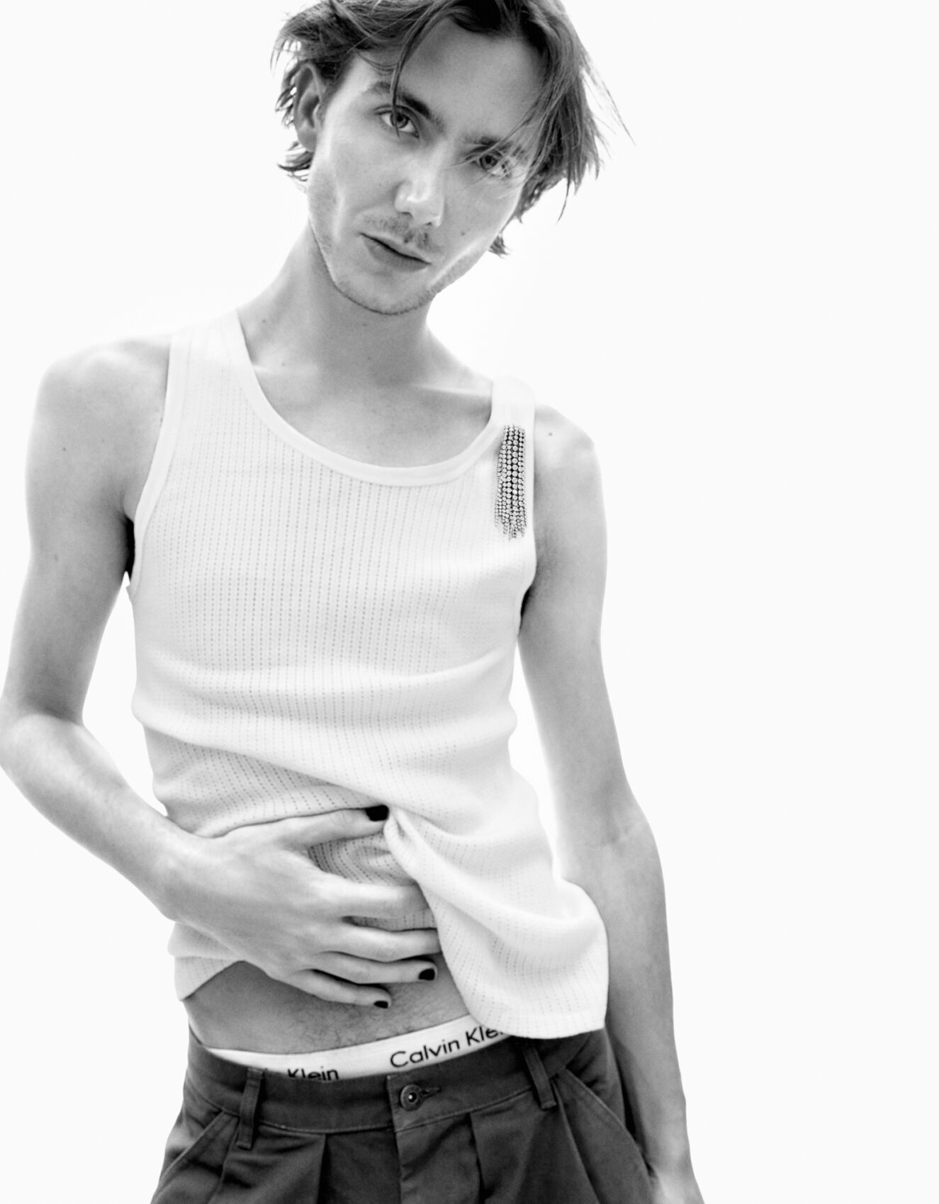 A person with light, tousled hair poses confidently against a plain backdrop. They wear a fitted, patterned tank top and light pants, complemented by a large, intricate necklace. The style evokes a minimalist, monochromatic aesthetic, emphasizing a sense of cool elegance and relaxed sophistication. The focus is angled slightly upward, adding an element of poise and self-assurance.
