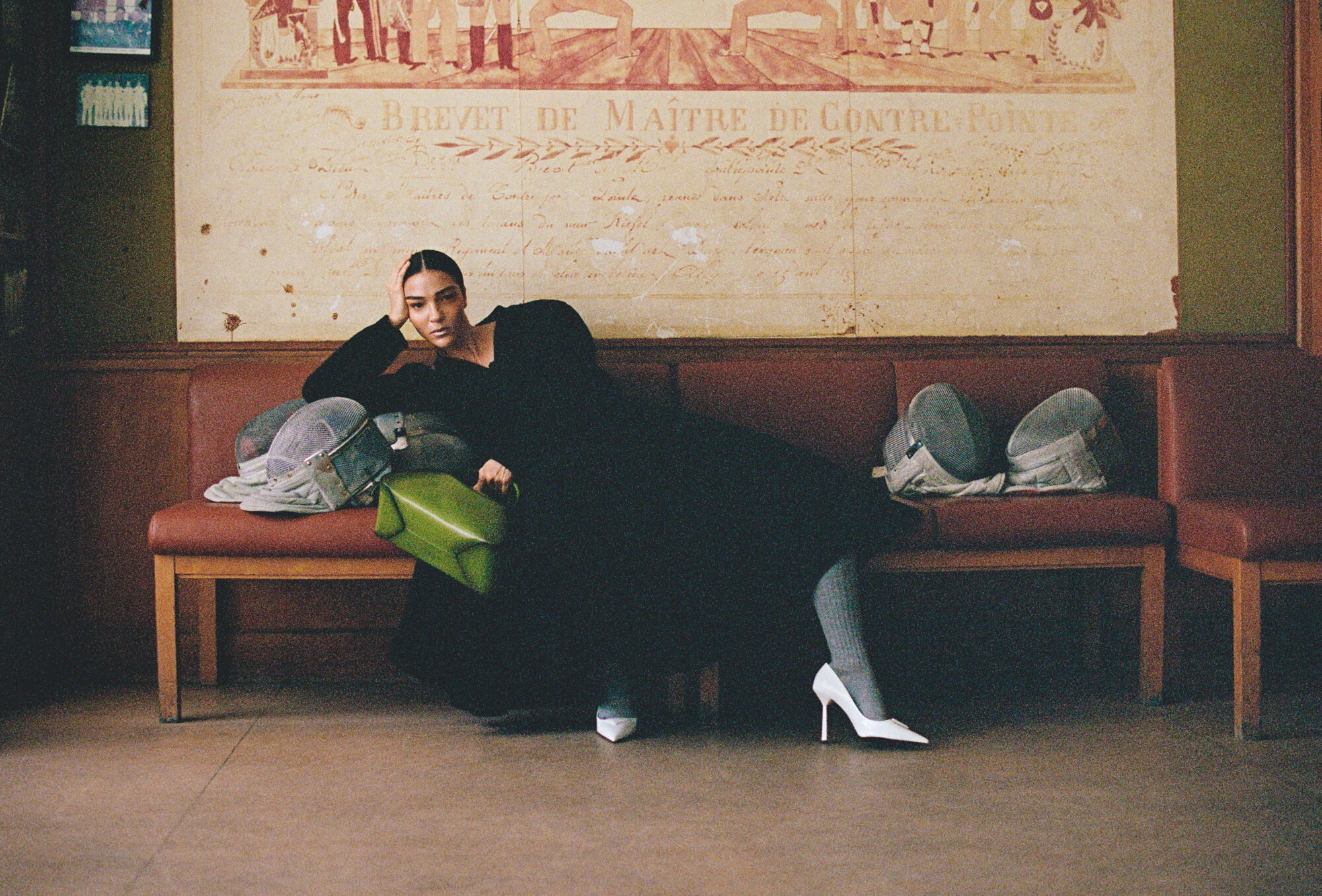 A person sits comfortably on a wooden bench with a red cushion, exuding a relaxed demeanor. They wear a black outfit paired with distinctive white high heels. Beside them, a vibrant green bag adds a pop of color. The backdrop features an artistic, vintage-style mural, creating a warm, inviting atmosphere in the room.