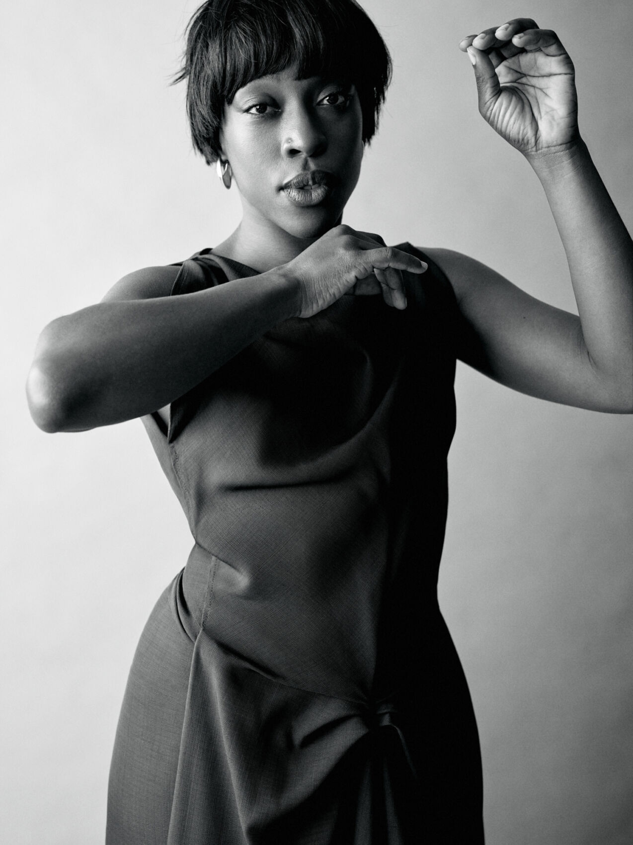 A person with short hair poses gracefully, captured in a monochrome setting. They wear a sleeveless dress featuring a subtle knot detail at the waist. One arm is bent near the face, while the other is raised, conveying a sense of movement and elegance. The lighting highlights the textures and contours, creating a striking visual composition.