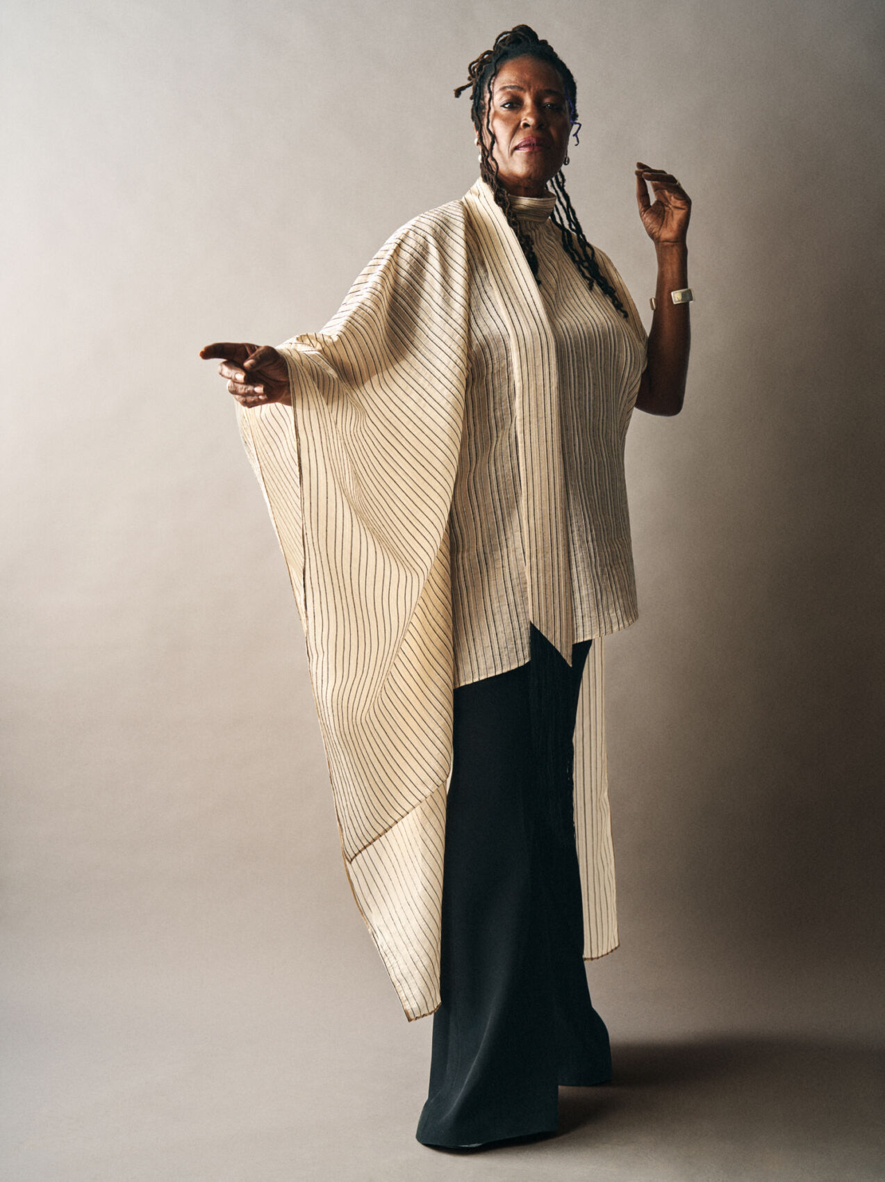 A person stands confidently against a neutral background, wearing a flowing, striped, light-colored garment with wide sleeves. Their attire extends downwards, contrasting with darker pants. The individual has an elegant posture with one arm outstretched, and their hair is styled with braids or twists. They wear minimal jewelry, including a wristwatch, enhancing their graceful and poised appearance.