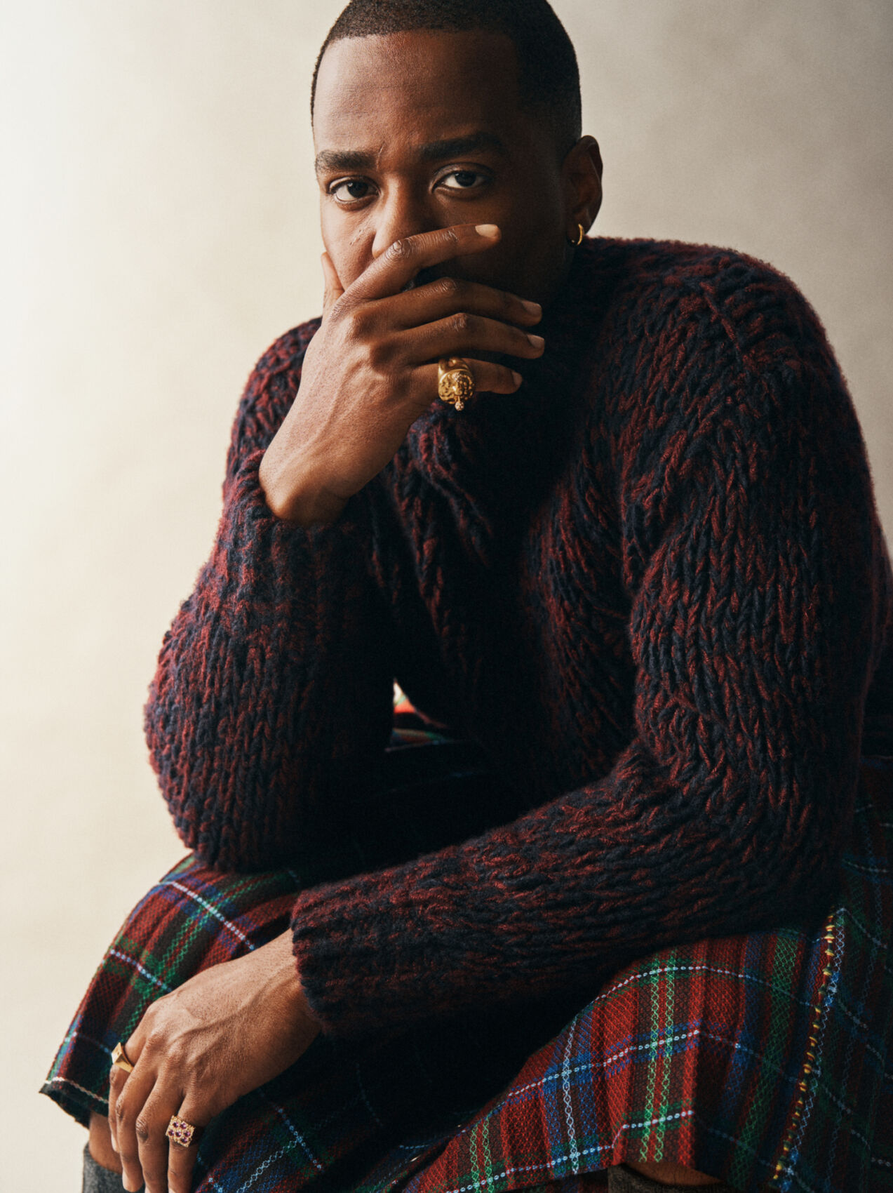 A contemplative individual sits, their hand partially covering their mouth. They wear a textured, dark sweater with intricate detailing and a gold ring with a lion motif. A plaid fabric in rich colors drapes over their lap. The person’s gaze is focused and intense, set against a softly lit, neutral background, creating a serene yet striking atmosphere.