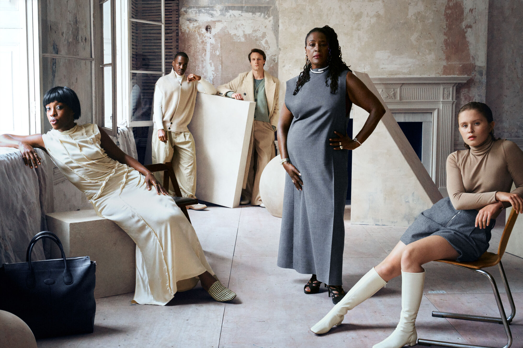 Five individuals pose with confidence in an elegantly styled, rustic interior. Their outfits vary from sleek dresses to cozy knits, showcasing a blend of textures and neutral tones. The setting features distressed walls, large windows, and an ornate fireplace, creating an artistic, modern atmosphere. Stylish accessories, such as boots and a leather bag, add sophistication to the scene.