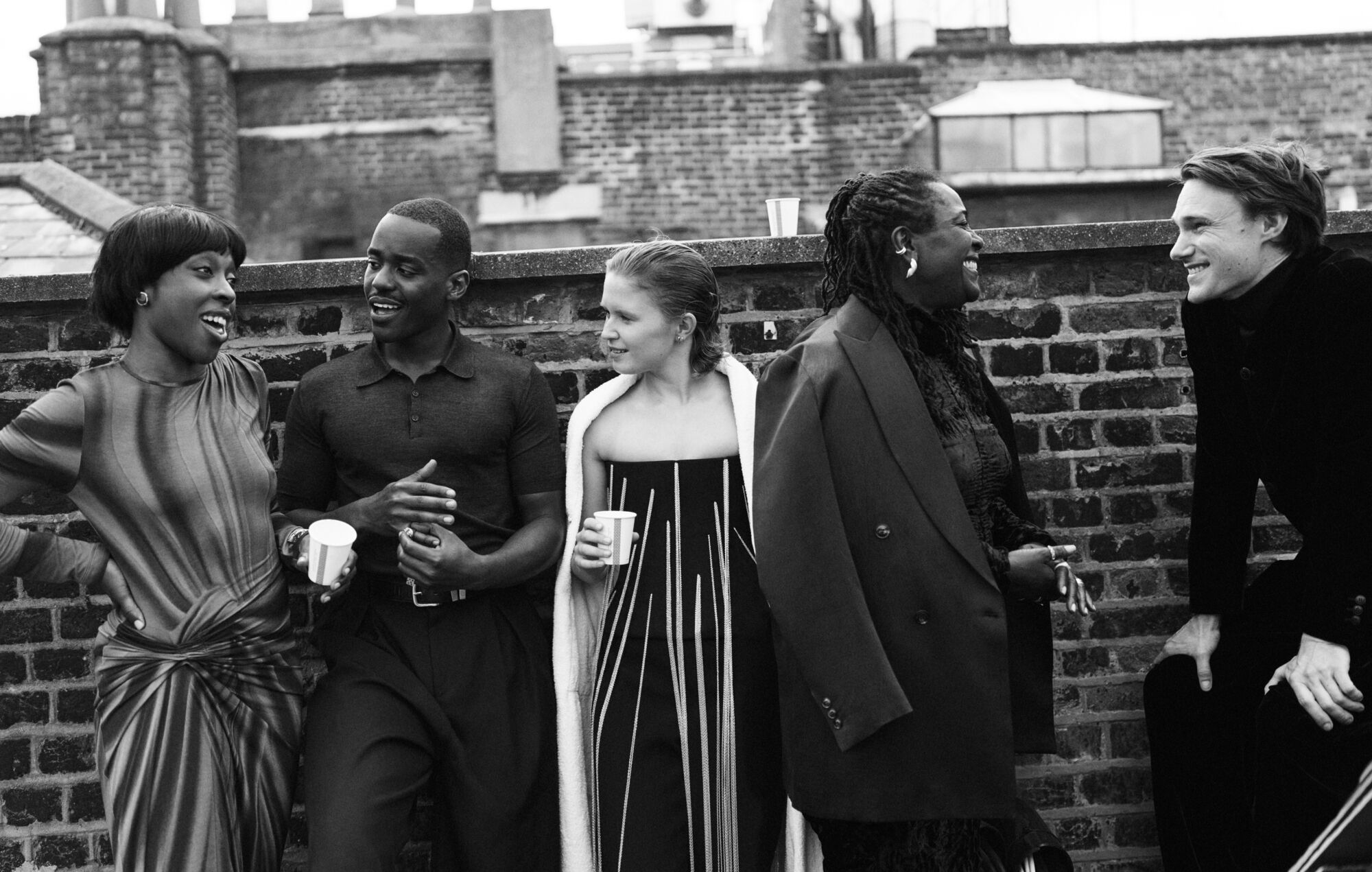 A group of five people stand together on a rooftop against a brick wall, engaged in lively conversation. One person on the left has short hair and is gesturing animatedly. Others hold cups, suggesting a casual gathering. The scene exudes a relaxed and friendly atmosphere, with everyone dressed in stylish attire, enjoying each other's company.