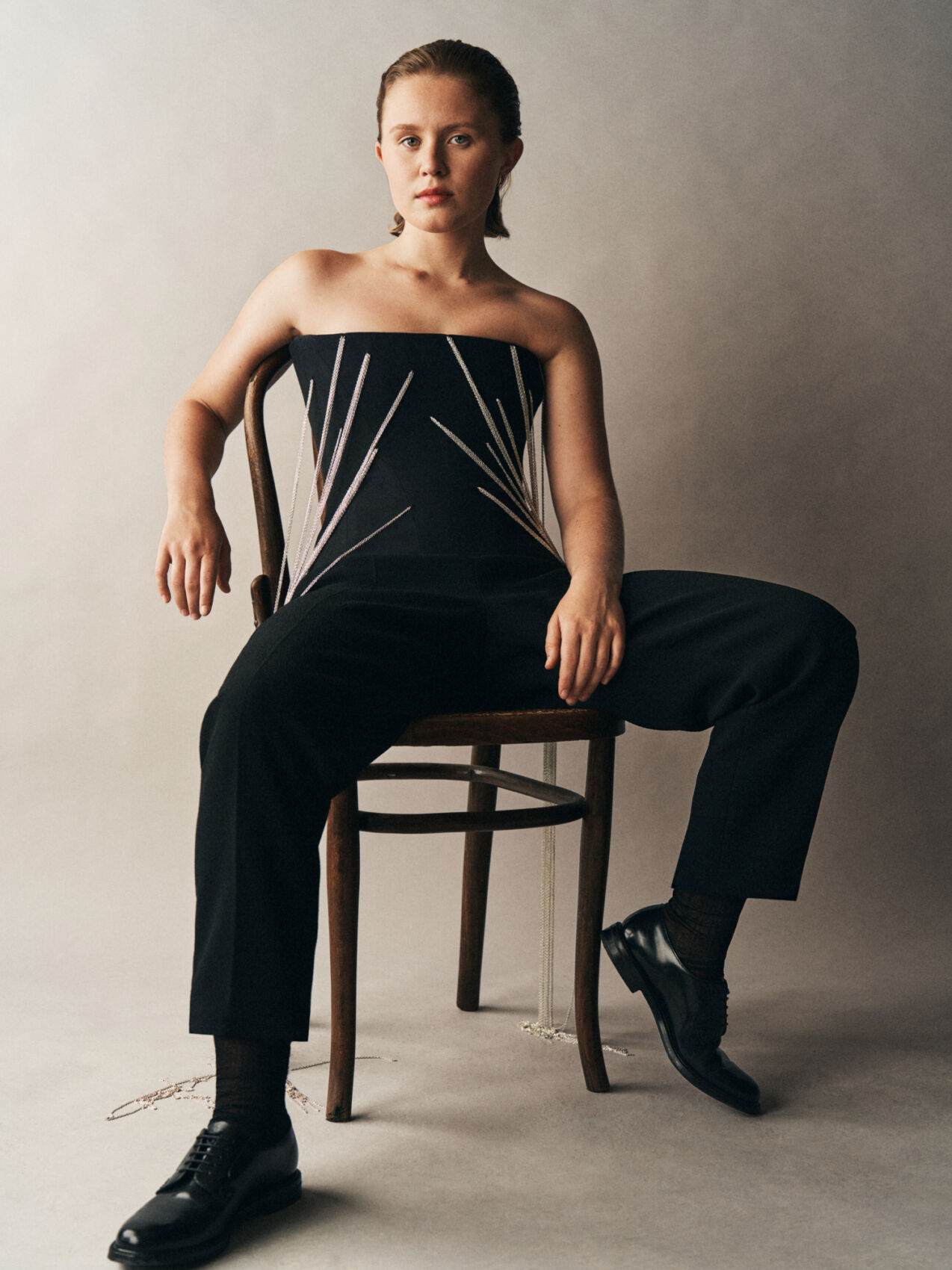 A person with short hair sits confidently on a wooden chair against a neutral backdrop, wearing a strapless top adorned with striking linear embellishments. The outfit is completed with sleek black trousers and polished shoes, projecting an air of sophisticated nonchalance. The overall mood combines elegance with a casual, self-assured presence, highlighting a blend of modern fashion aesthetic.