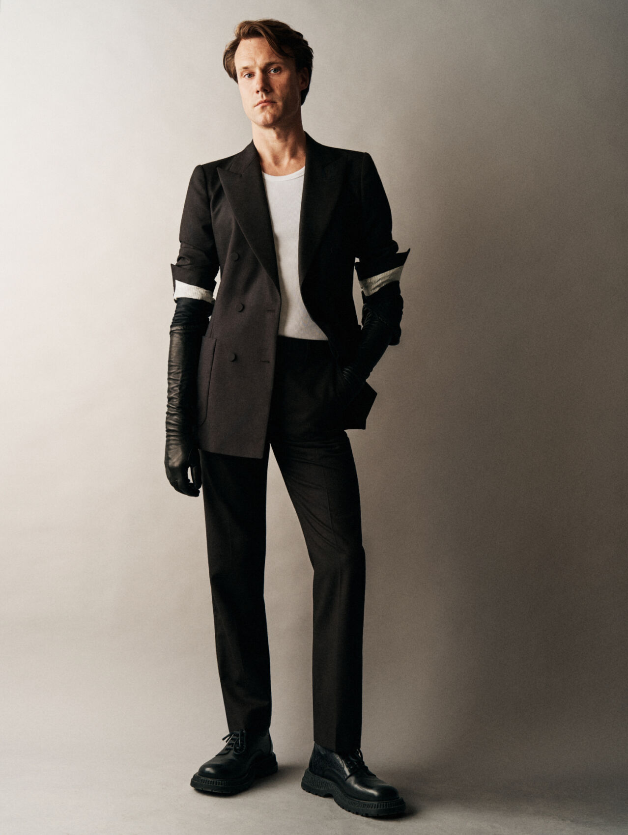 A person stands confidently against a neutral backdrop, wearing a dark suit with rolled-up sleeves, showcasing a white inner shirt. Black gloves and chunky shoes complete the ensemble. The individual exudes a stylish and modern vibe, blending classic and contemporary fashion elements, with a relaxed yet poised stance, evoking a sense of effortless elegance and sophistication.