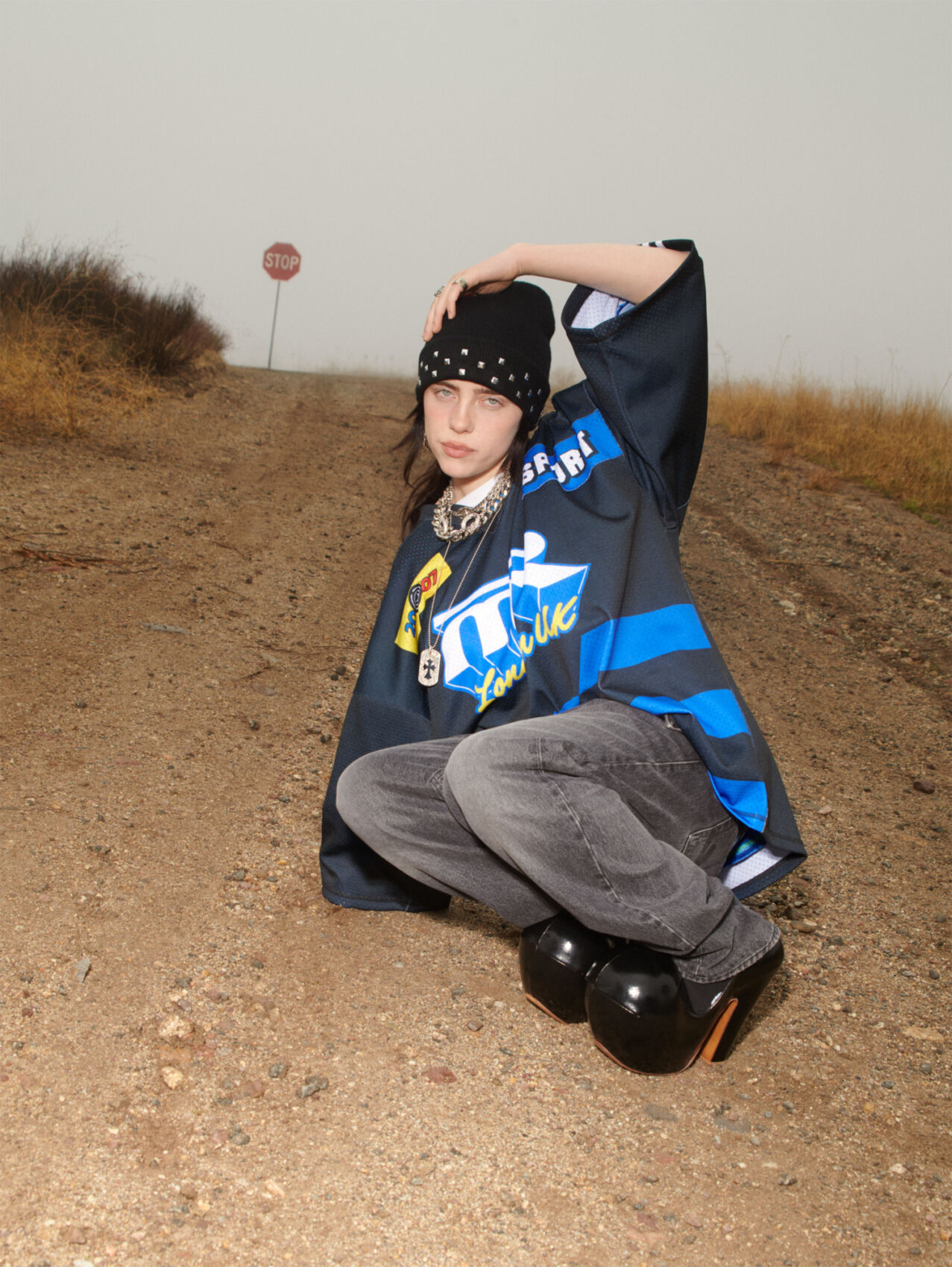 A person crouches on a gravel path, wearing a black beanie with studs, a chain necklace, oversized jersey, and gray jeans. Their hand rests on their beanie. The background features dry grass and a misty sky with a red octagonal sign in the distance. The setting has a rugged, natural feel, contrasting with the person's bold attire.