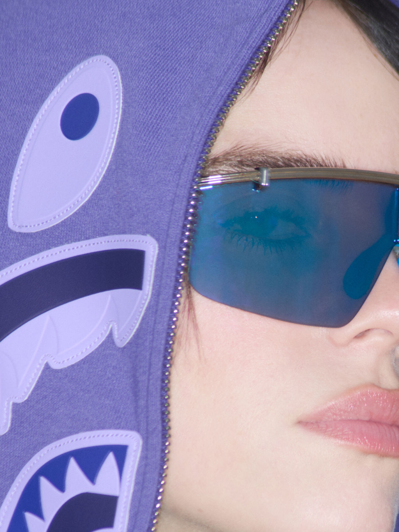 A person is wearing reflective blue sunglasses and a purple hoodie zipped up partially over the face. The hoodie features a stylized design resembling a shark with eyes and teeth. The close-up view highlights the person's eye through the glasses and their lips, suggesting a fashion-forward, edgy style with attention to detail and color contrast.