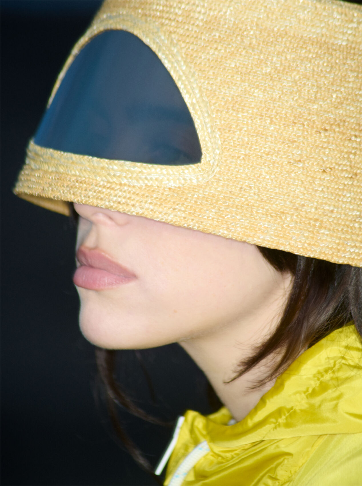 A person is wearing a unique woven headpiece that covers the upper face, featuring a transparent visor. The headpiece resembles a futuristic visor blending style and functionality. The clothing is yellow, matching the headpiece's tone, creating a cohesive look. Soft lighting highlights the facial features, while the background is a deep black, adding contrast to the ensemble.
