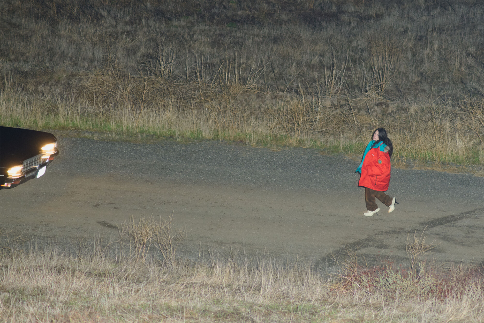 A person walks on a gravel path, wearing a large red and teal jacket with dark pants and white shoes. The background features dry grass and shrubs on a sloping terrain. Approaching from the left, the headlights of a dark vehicle illuminate the scene, casting a glow amidst the quiet, open landscape at night.