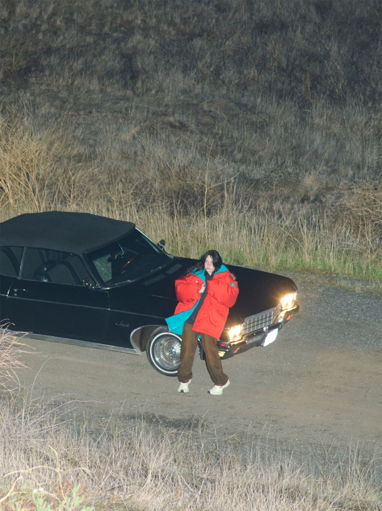 A person stands beside a black vintage car on a dirt path, surrounded by dry grass and rugged terrain. They wear a bright orange and blue jacket with brown pants and beige shoes. It's nighttime, with the car's headlights illuminating the scene. The atmosphere feels quiet and slightly mysterious, with a sense of adventure.