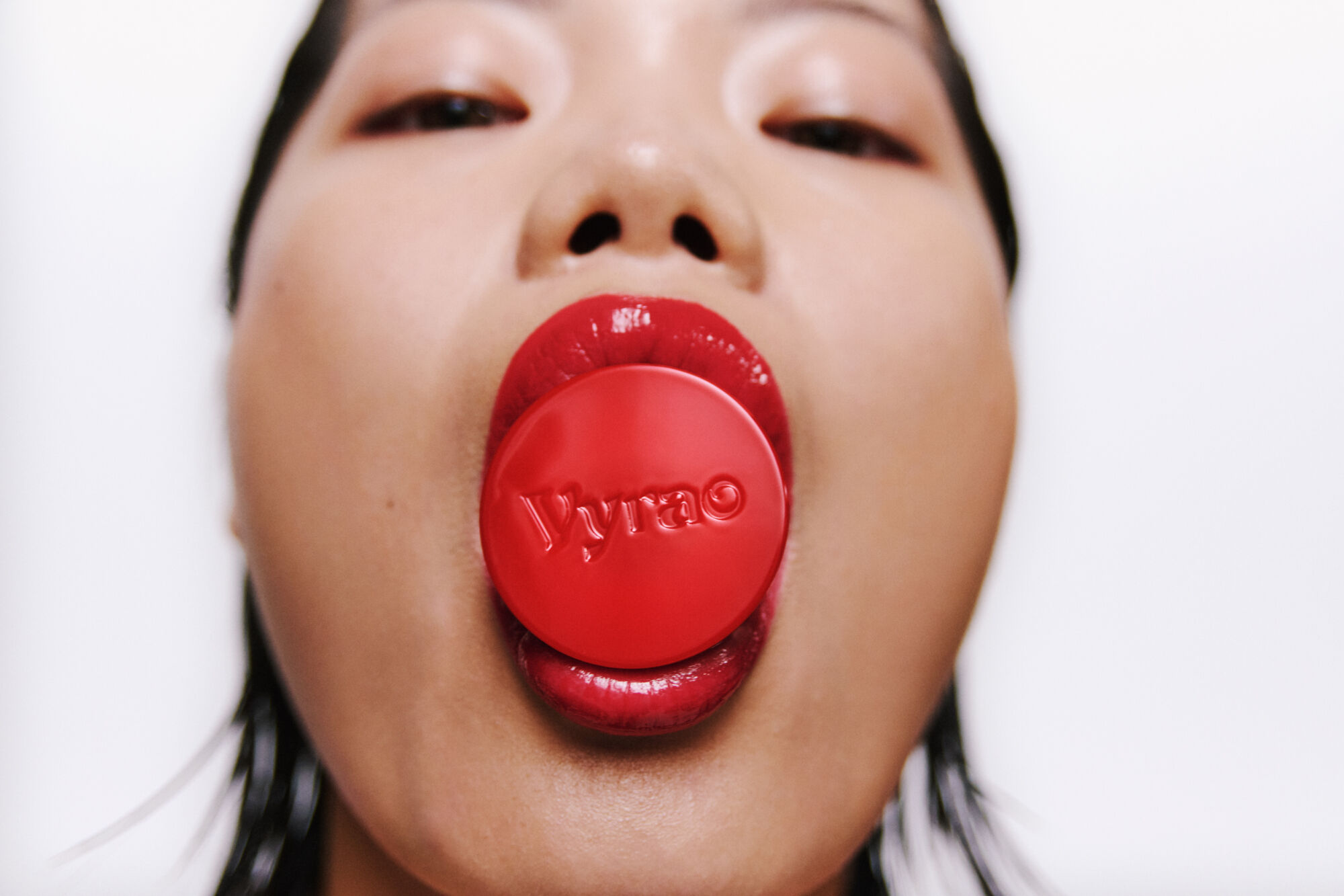 A close-up of a face is shown with lips slightly parted, revealing a glossy red object being held in the mouth. The lips are painted in a matching red shade, creating a bold contrast against the smooth skin. The perspective is from below, highlighting the object's color and texture, while the expression remains enigmatic and striking.