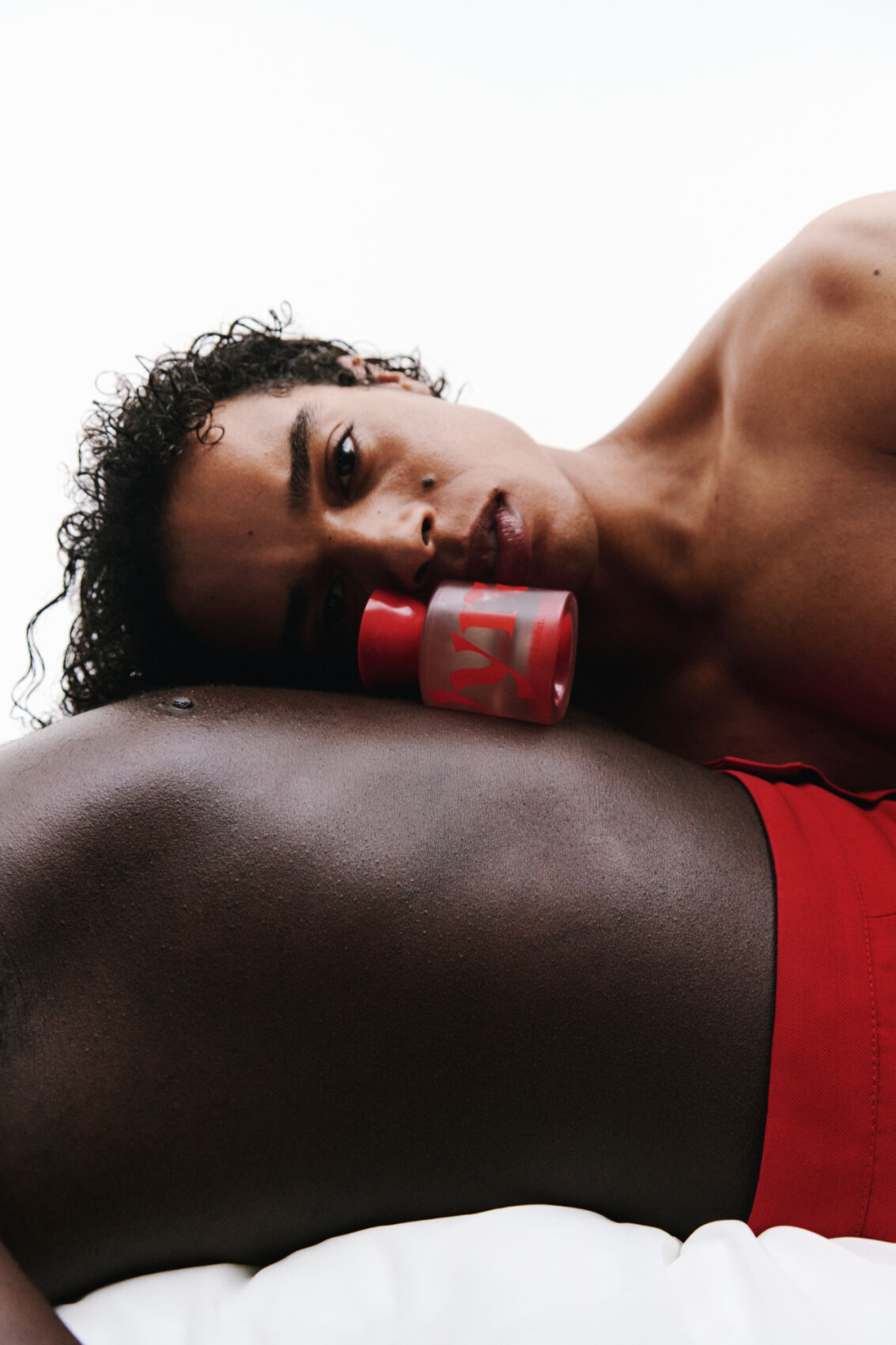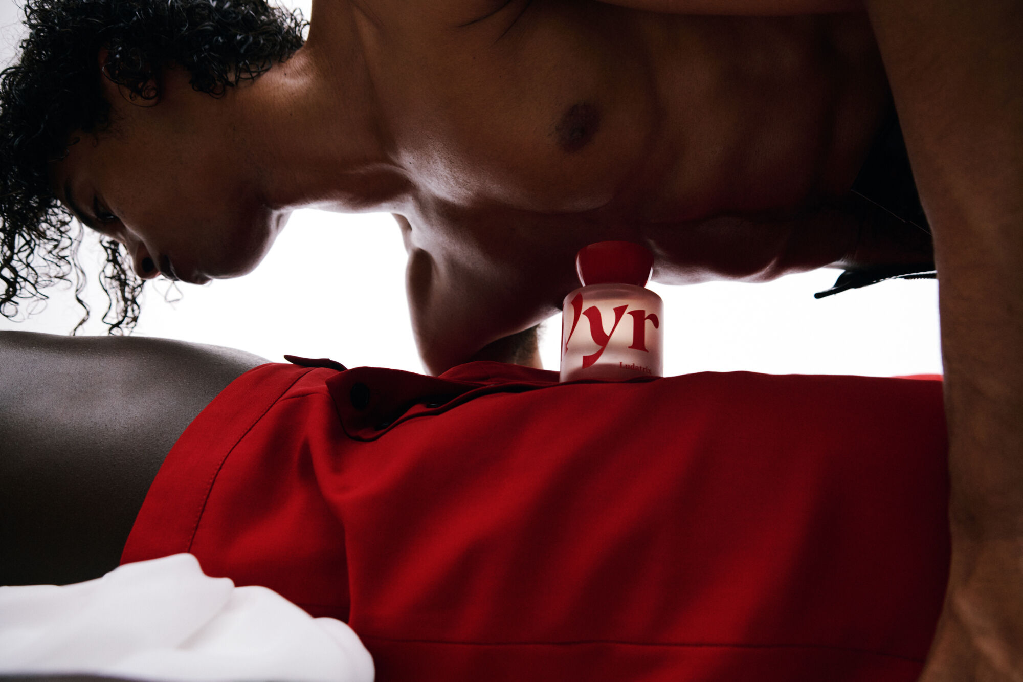 A close-up captures two figures in an intimate position. One person is leaning over another, who is lying down wearing a bright red garment. A small bottle, rounded with a red cap, rests on the horizontal figure’s torso. The scene is minimalist against a white background, emphasizing the contrasts in color and tension between the figures.