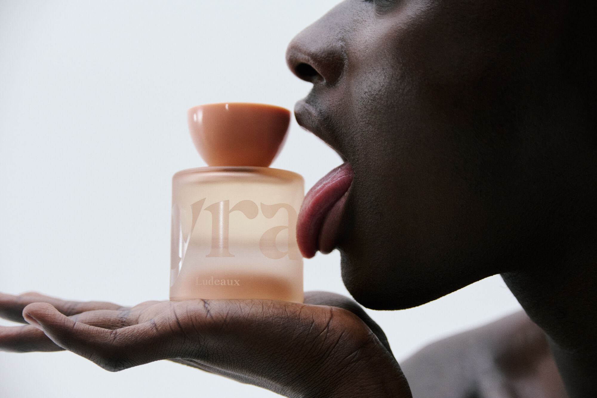 A close-up of a person engaging with a glass bottle, featuring a peach-hued cap. Their hand supports the bottle, with fingers gently curved beneath it. The person’s face is turned to the side, lips slightly parted, and tongue extended towards the bottle. The background is softly illuminated, creating a sense of contrast and focus.