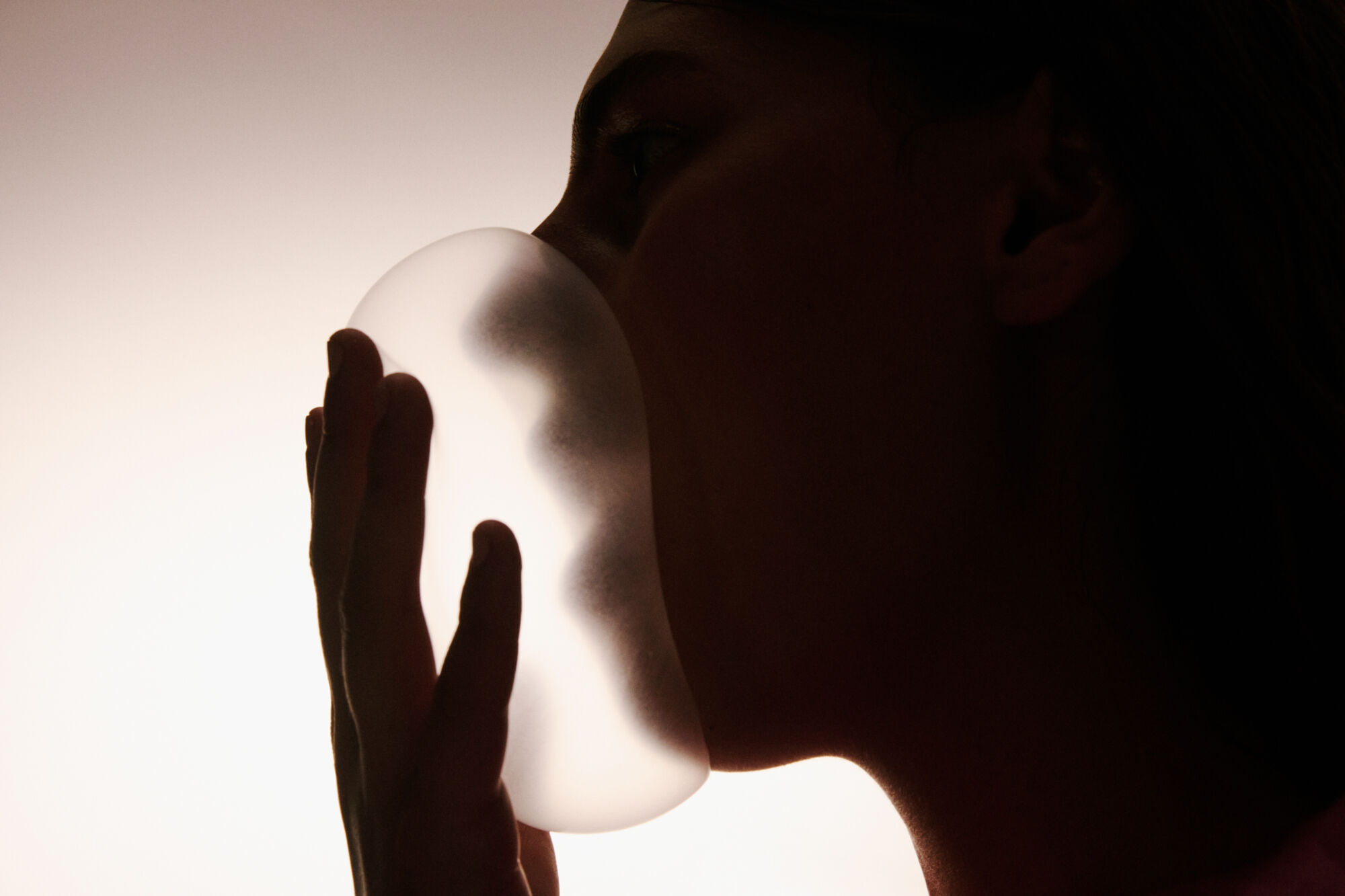 A person is captured in profile, blowing a large, translucent bubble. The light source from behind highlights the delicate contours of the bubble and silhouettes the facial features. The hand is gently supporting the bubble, creating a contrast between the bubble’s smooth surface and the shadowed outline of the figure against a soft, neutral background.