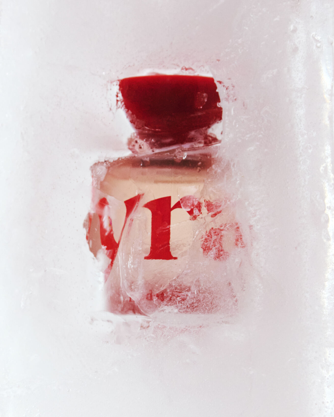 Encased in ice, a transparent bottle with a bold red cap is visible, partially obscured by frost. The scene is dominated by white and red hues, with intriguing textures formed by the ice on the surface. The composition hints at coldness and preservation, contrasting the smooth glass against the rough, frozen surroundings. The overall atmosphere is crisp and refreshing.