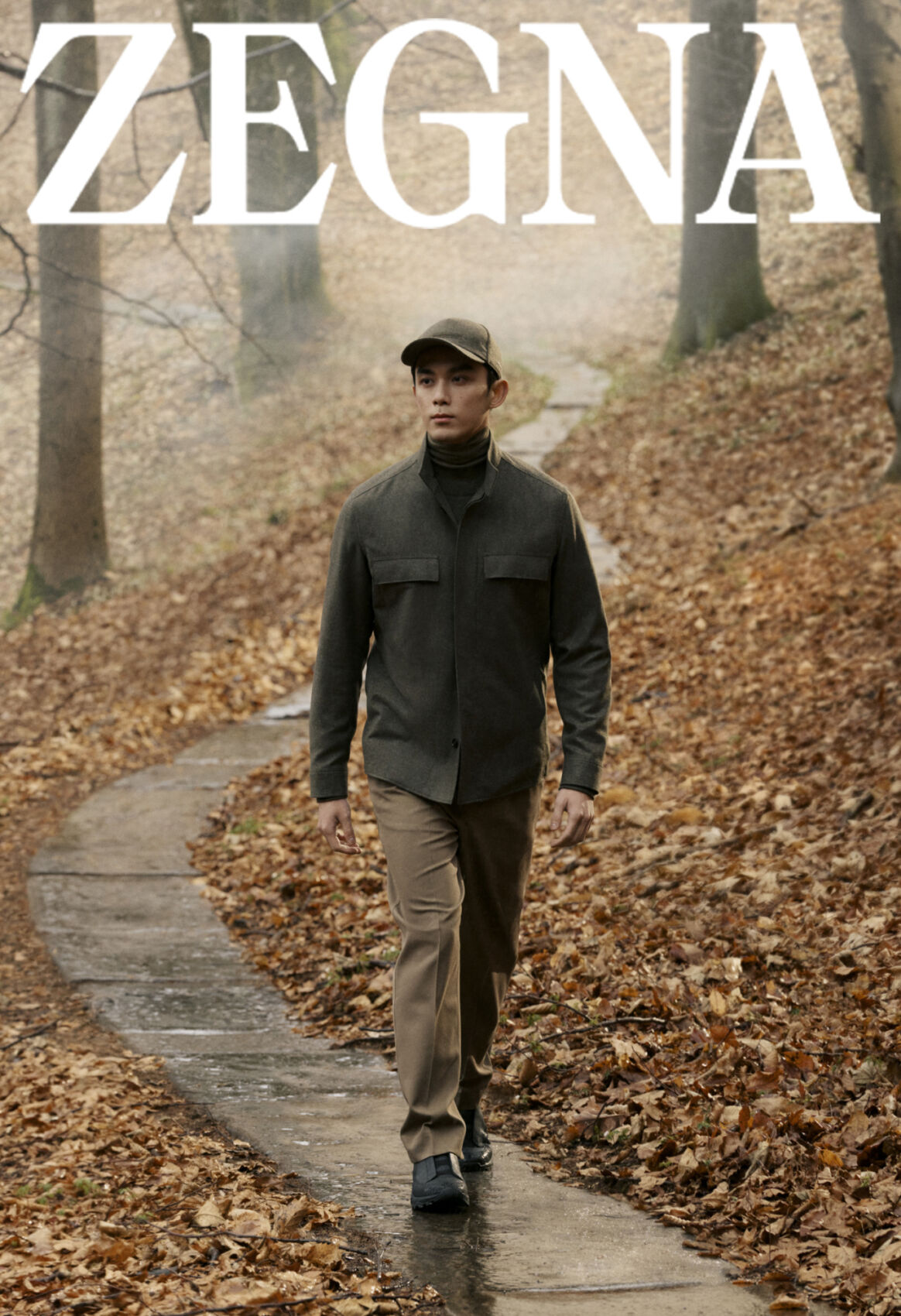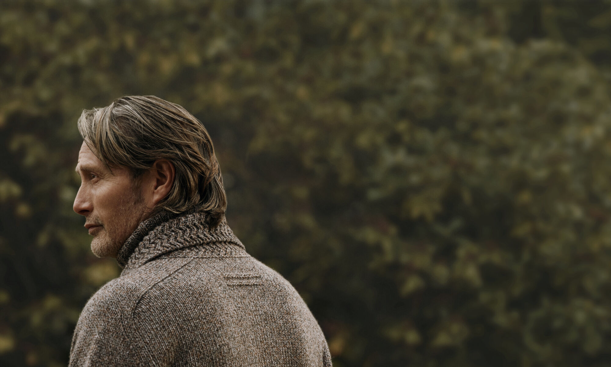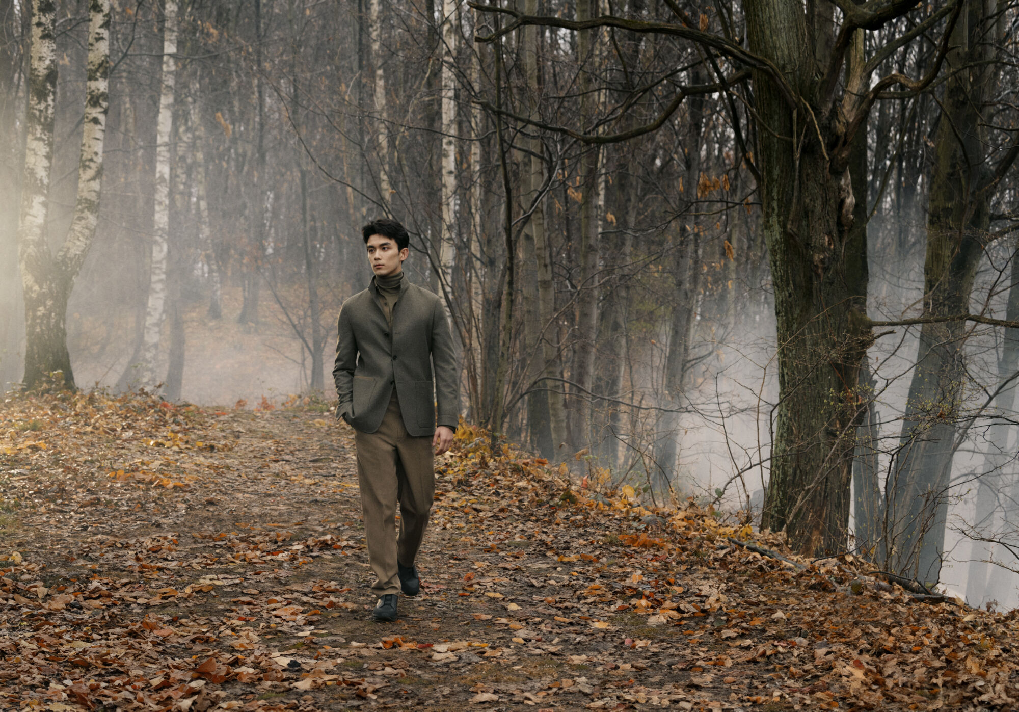 A man stands in a wooded area, wearing a grey cap and matching jacket. His gaze is directed slightly to the side, and he wears a dark turtleneck underneath. The background features tall trees, with soft, diffused lighting casting shadows, suggesting a serene, natural setting. The overall atmosphere appears calm and introspective.