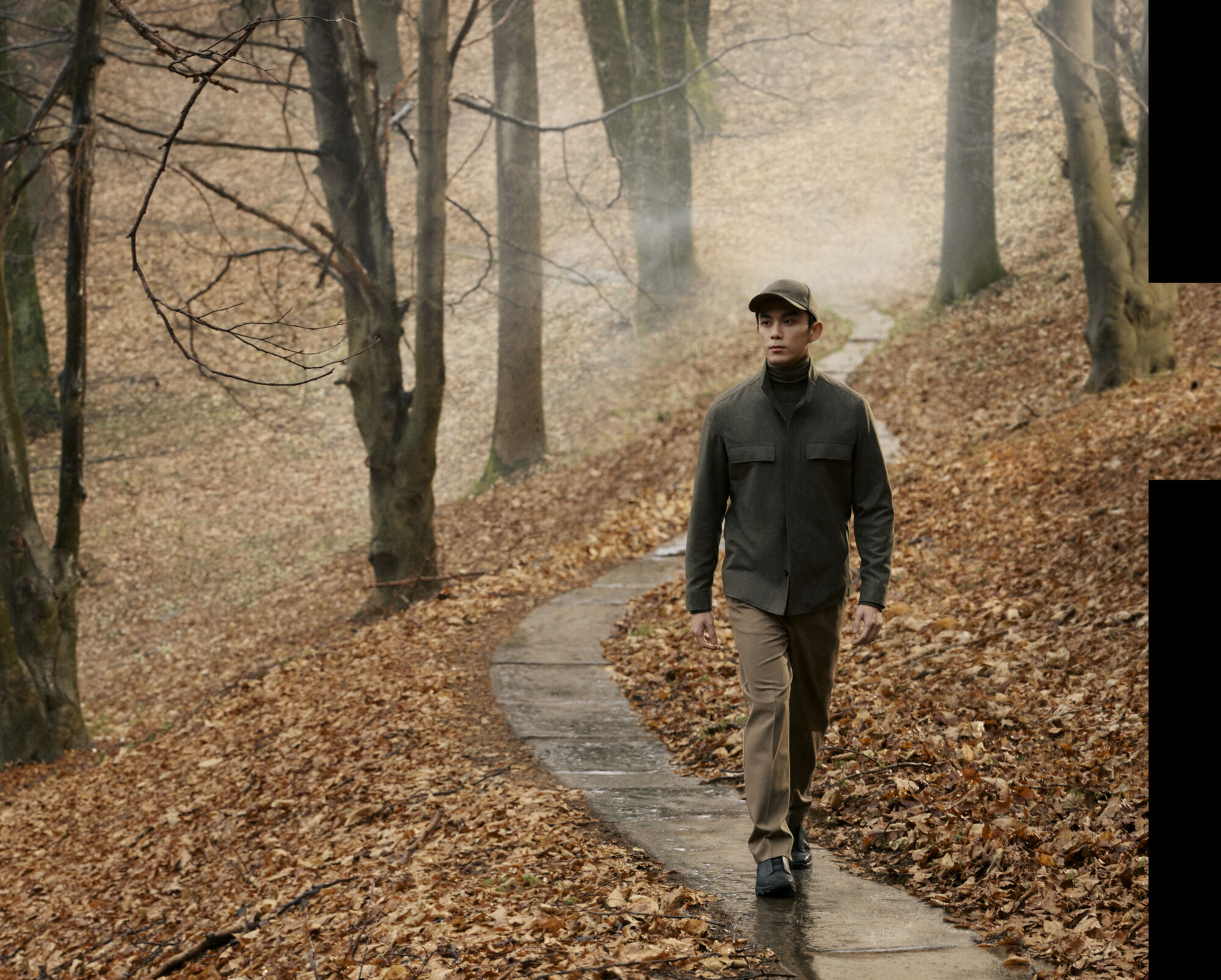 A person walks along a narrow path through a serene autumn forest, surrounded by fallen leaves. They wear a dark jacket, beige trousers, and a matching cap, conveying a sense of quiet elegance. The atmosphere is calm, and the muted colors of the attire blend harmoniously with the earthy tones of the natural setting.
