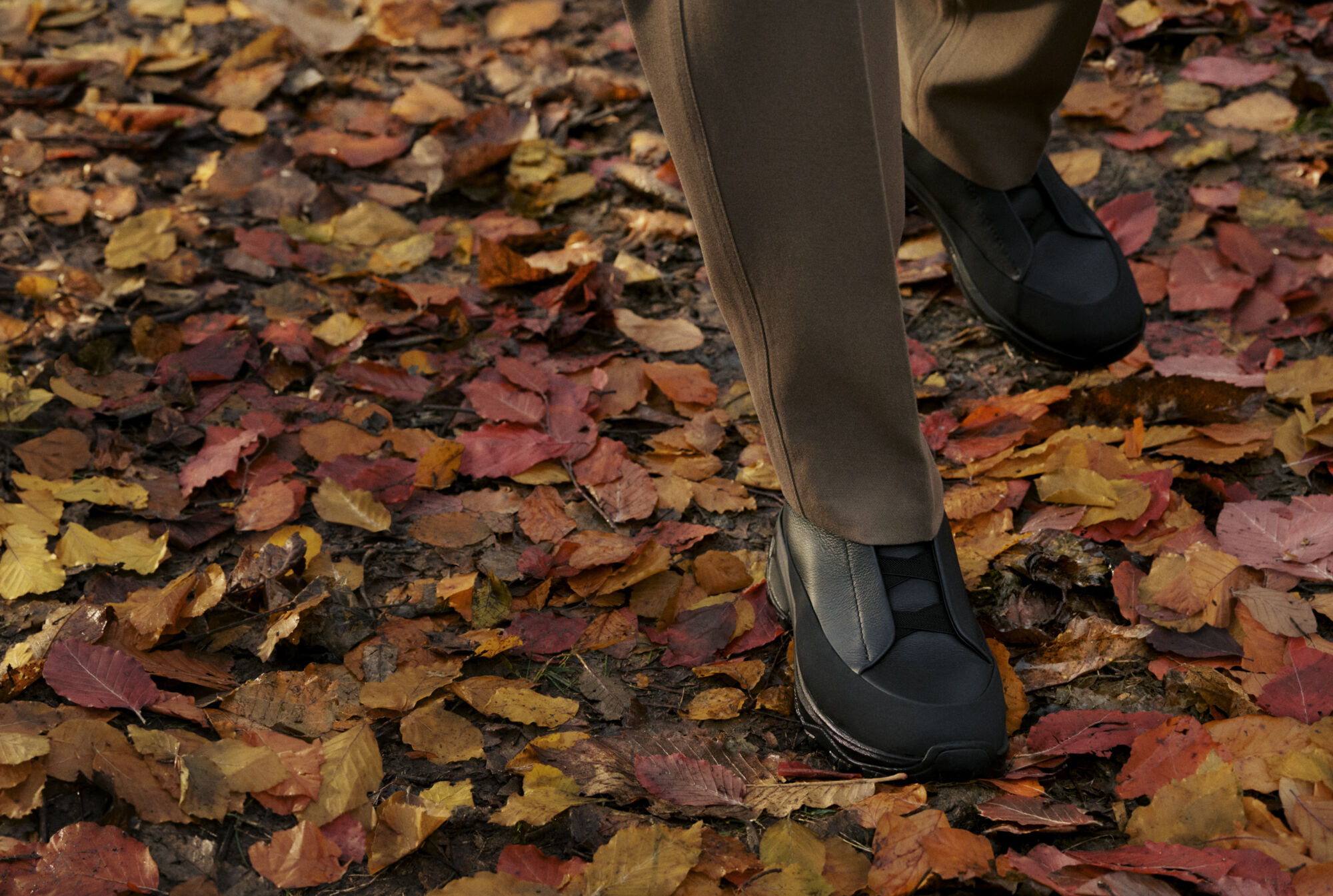 A person walks through a ground carpeted with vibrant autumn leaves, wearing sleek black shoes and brown pants. The leaves showcase a spectrum of fall colors, from golds and reds to browns and oranges, blending harmoniously. The scene captures the essence of a crisp autumn day, highlighting the earthy textures and patterns beneath the feet.