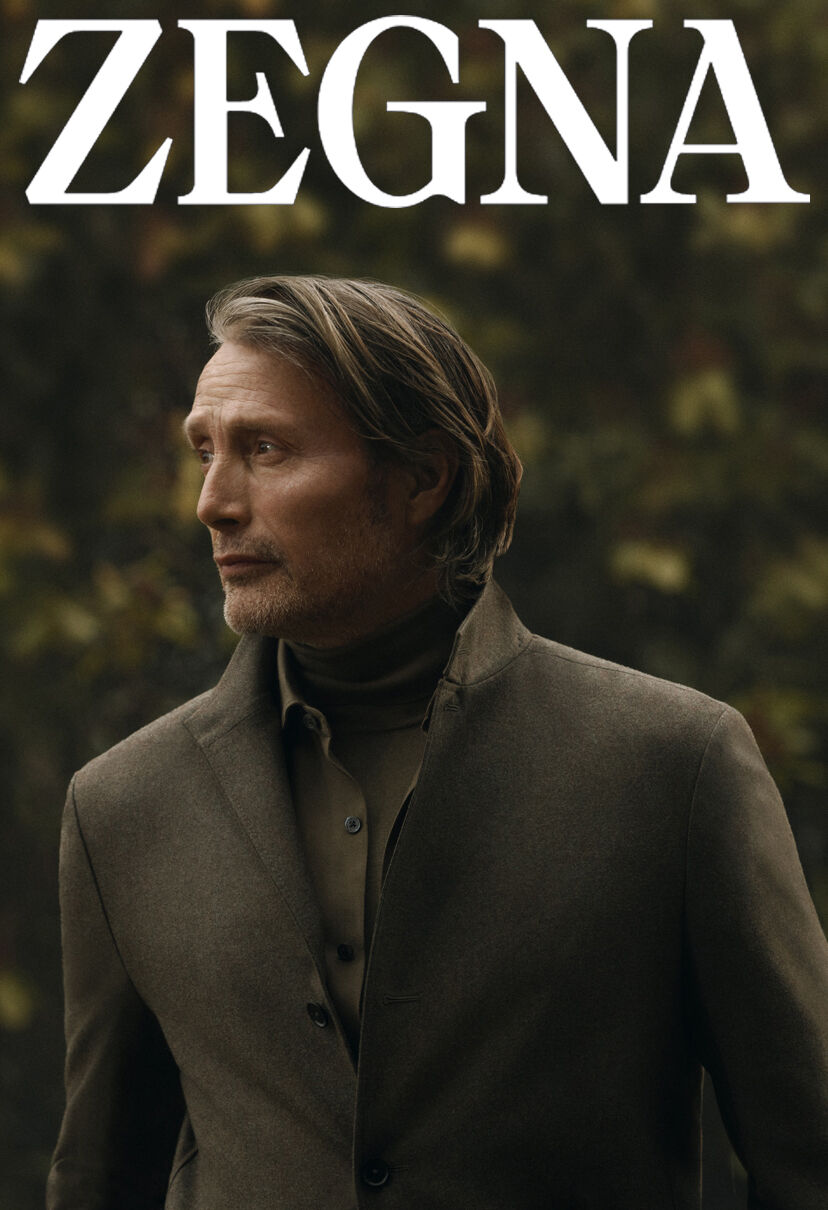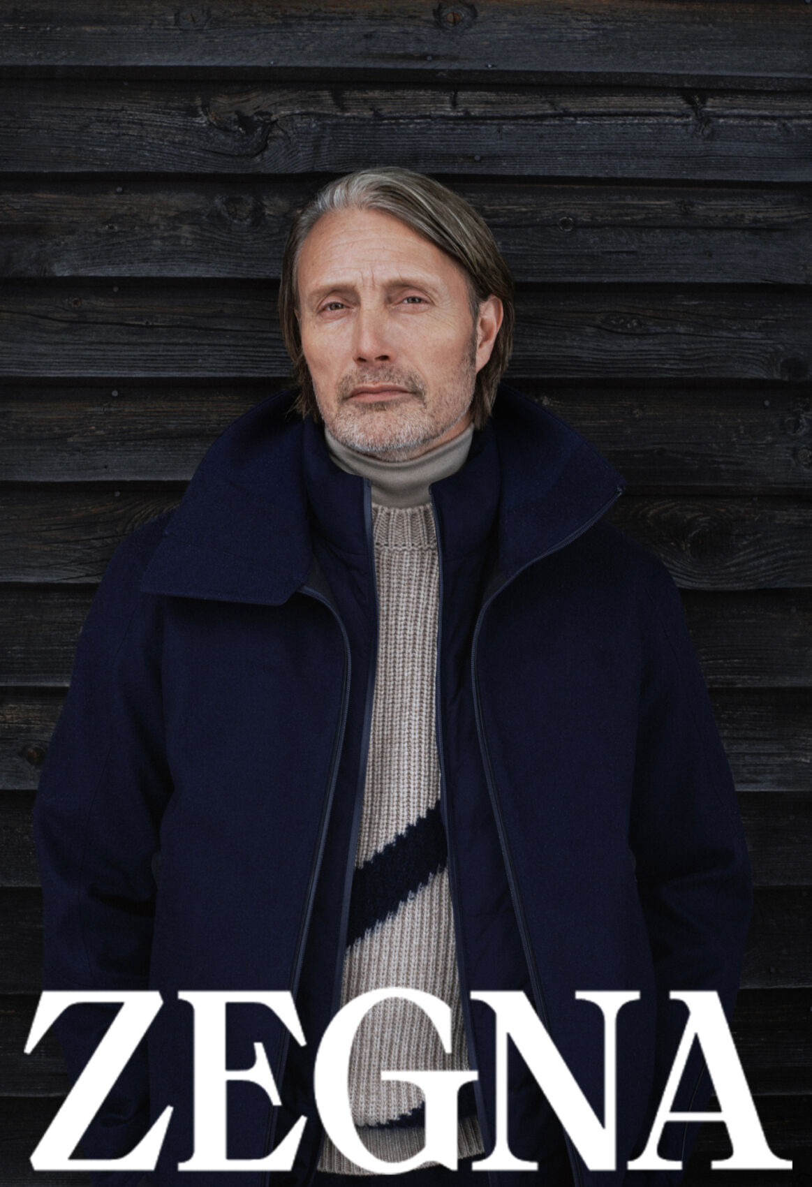 A man stands against a background of dark wooden planks, wearing a stylish navy coat with a high collar. Underneath, he sports a turtleneck and a vertically ribbed sweater with a diagonal stripe. His hair is neatly combed back, and he has a short beard, giving him a sophisticated appearance. The overall tone is elegant and timeless.