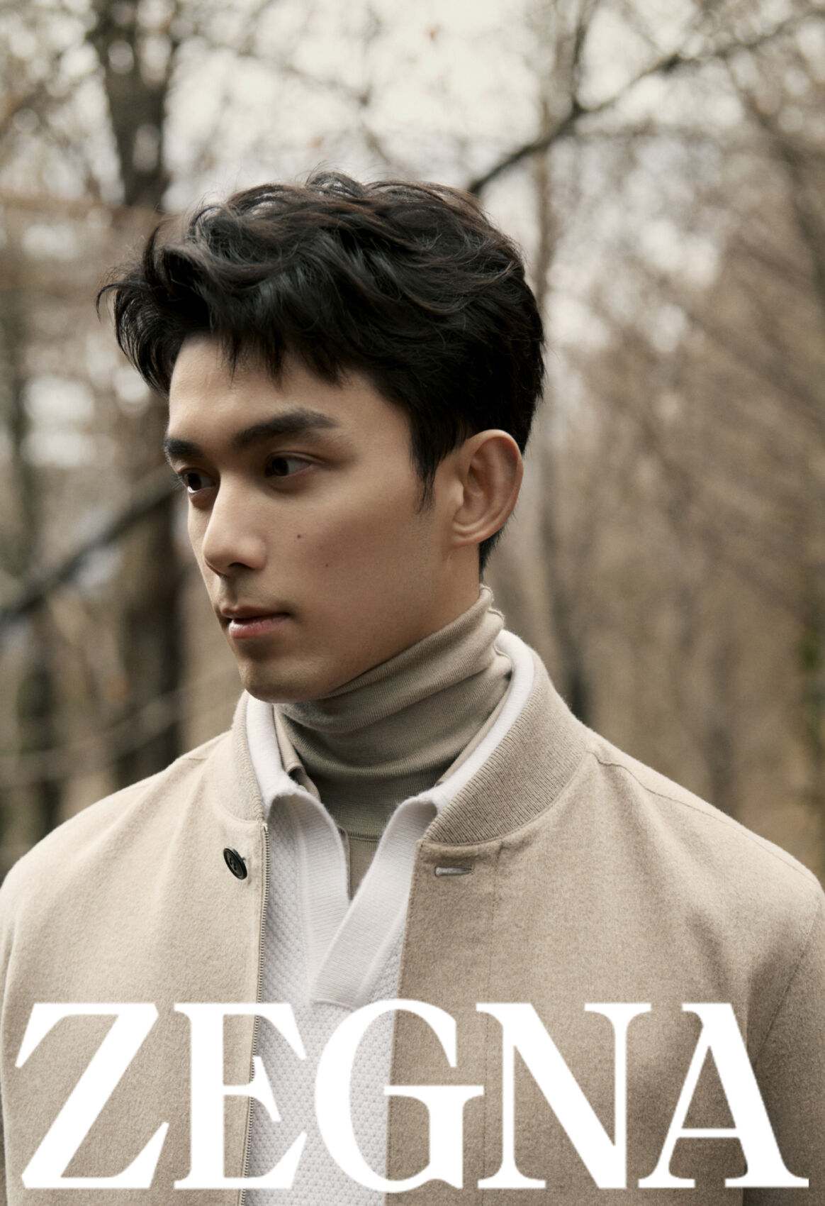 A man gazes thoughtfully, dressed in a sophisticated ensemble featuring an olive turtleneck and a sharp, tailored coat. His dark hair is neatly styled, enhancing his contemplative expression. The background showcases a blurred, natural setting with bare trees, suggesting a serene, outdoor atmosphere. The overall mood is elegant and introspective, highlighting a sense of refined fashion and subtle allure.